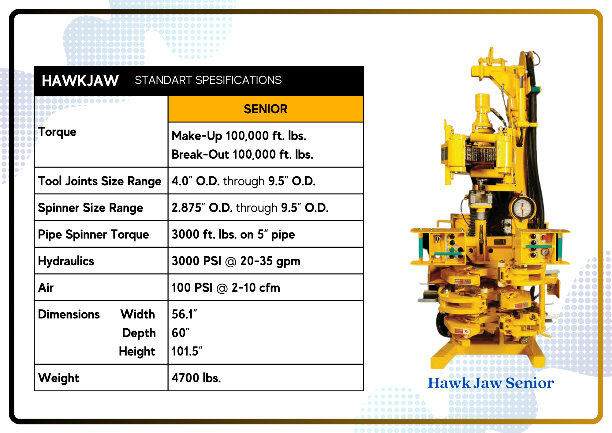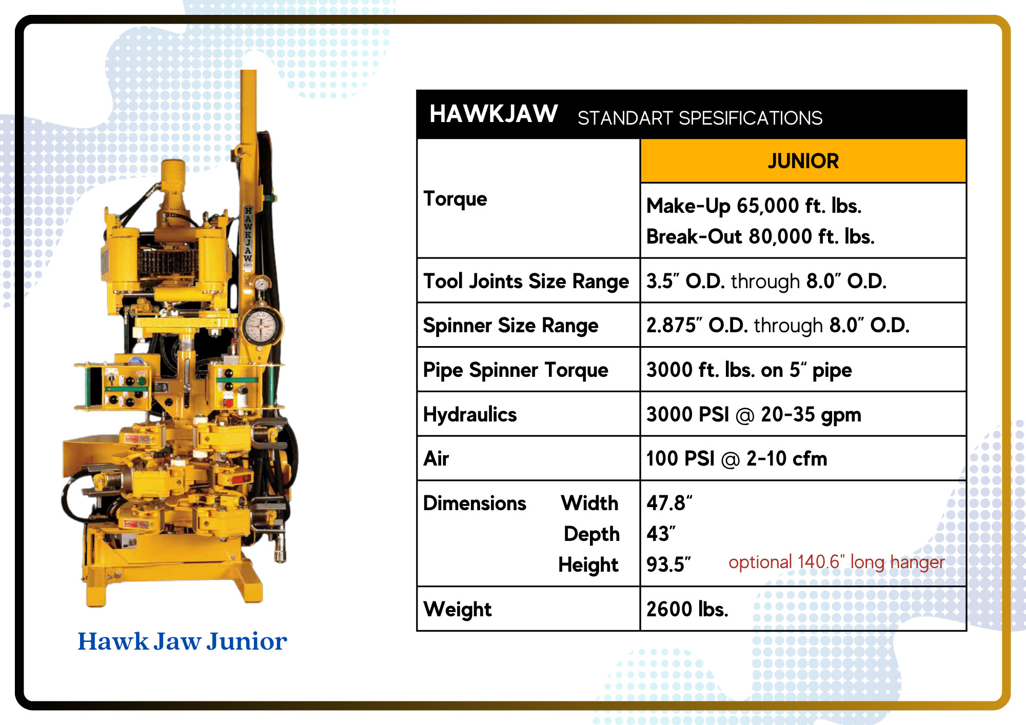 The HAWKJAW Power Tong was the industry’s first fully integrated Drill Pipe Make/Break Machine. With its proven spinning wrench and patented torque wrench, it remains a favorite of drillers and floor hands alike due to its speed, ease of operation, and inherent safety.